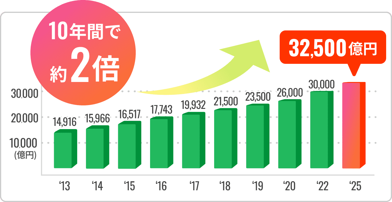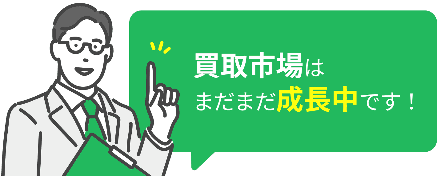 買取市場は2009年以降、着実に拡大し続けておりこれからも安定的に成長していくことが見込まれています。不況のときこそ売り手が増えるため不況に強いビジネスモデルです。