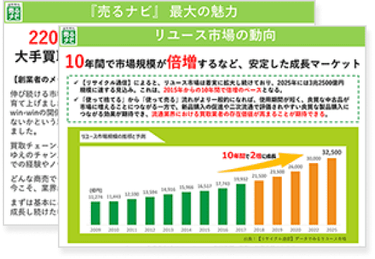買取市場は2009年以降、着実に拡大し続けておりこれからも安定的に成長していくことが見込まれています。不況のときこそ売り手が増えるため不況に強いビジネスモデルです。